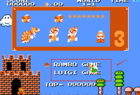1、关注屏幕上方的分数和时间,选择你想要的游戏模式:RAMBO GAM或LUIGI GAME,准备好开始冒险吧。