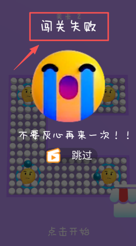 4、若不幸闯关失败,点击橙色跳过按钮跳过,或用底部的灰色点击开始,再次尝试,证明你的实力吧!