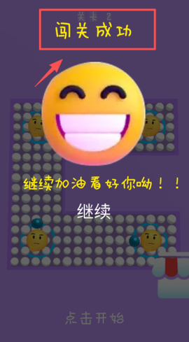 3、当看到闯关成功的界面时,点击下方的白色继续按钮继续冒险,或者选择底部的灰色点击开始,重新挑战~