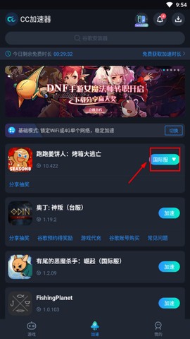 1、先打开CC加速器,找到跑跑姜饼人官方版,选择你想加速的服务器,包括国际服和港服,方便你的游戏体验。