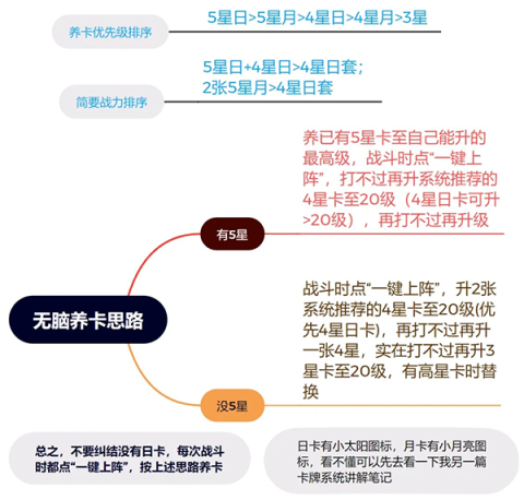 养成卡片的简单来说就是:集中资源在五星卡上,其他卡片则要根据战场星谱匹配意义进行选择。在某一关卡难以通关时,可以尝试将已有的卡片升级到10级,如果顺利通过则无需继续提升。避免在不清楚战斗情况的情况下盲目养成,这样在后期可能会遭遇到卡关,因为战斗中的星谱要求相当多。